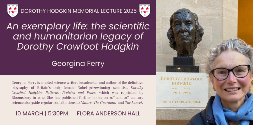 Join Principal Catherine Royle on 4th March 2025 as she welcomes alumni, students and friends to the annual Dorothy Hodgkin Memorial Lecture. This year, we are privileged to welcome for the event the noted science writer Georgina Ferry for her lecture entitled ‘An exemplary life: the scientific and humanitarian legacy of Dorothy Crowfoot Hodgkin‘.